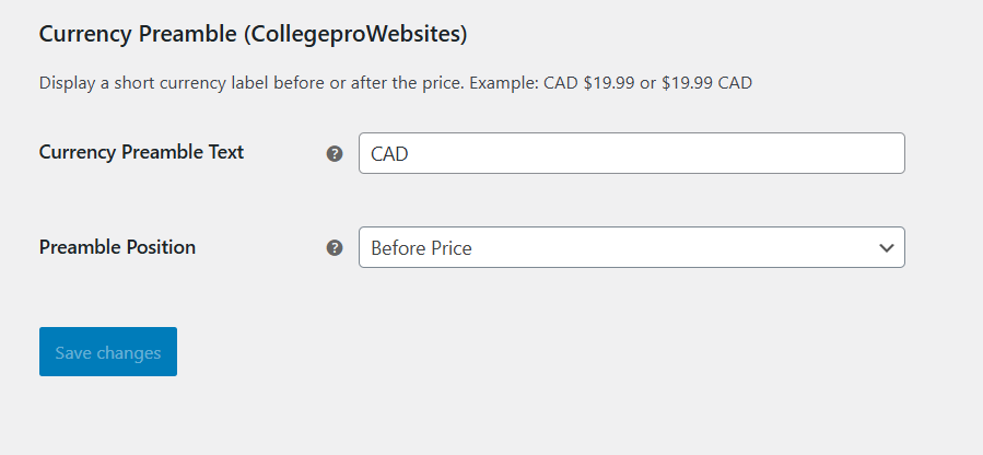 This plugin solves that problem by letting you add a currency preamble before or after the price display.