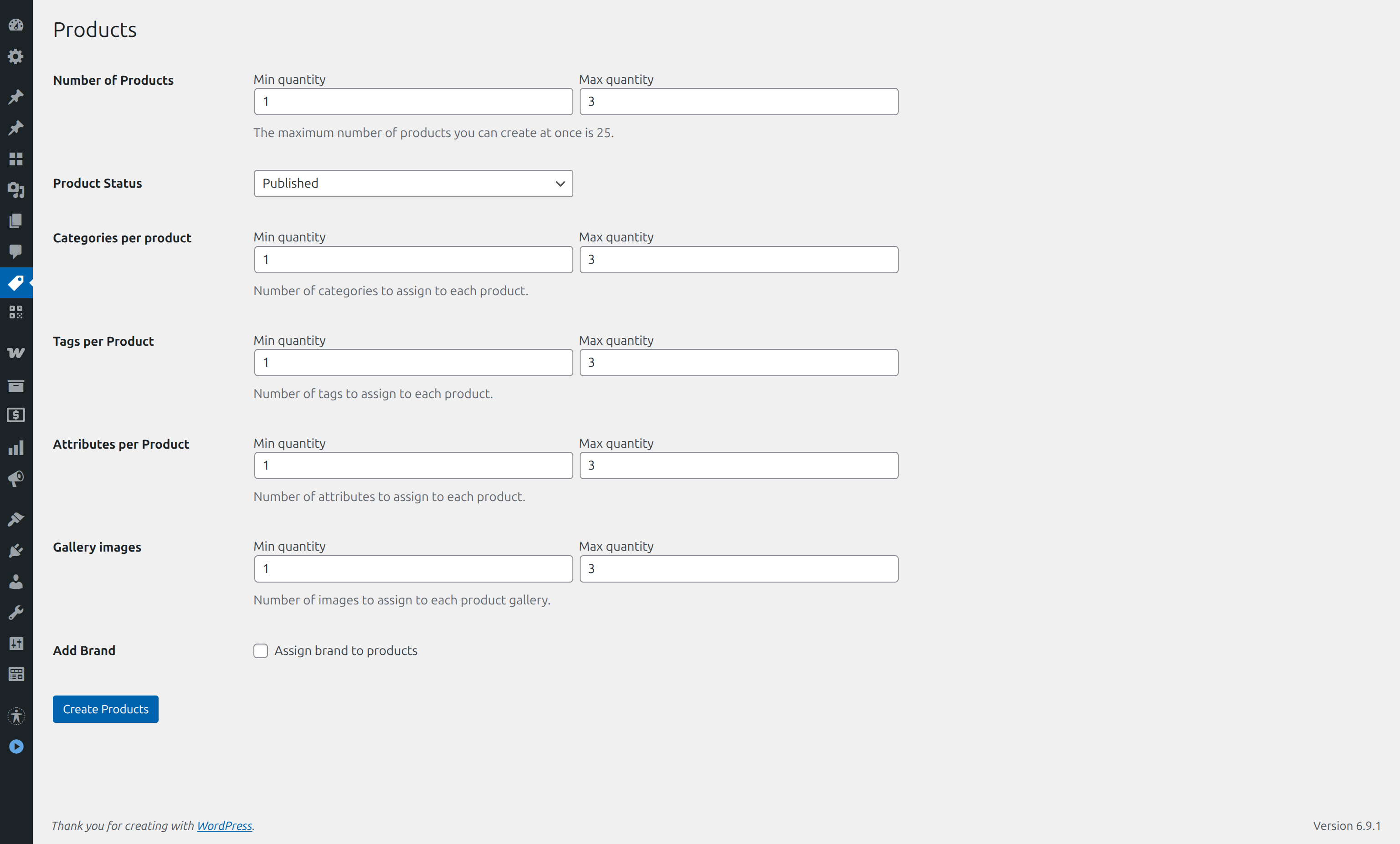 The plugin generates realistic product data including product names, descriptions, prices, images, categories, and other WooCommerce product attributes.